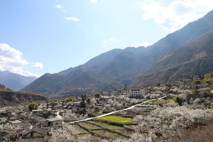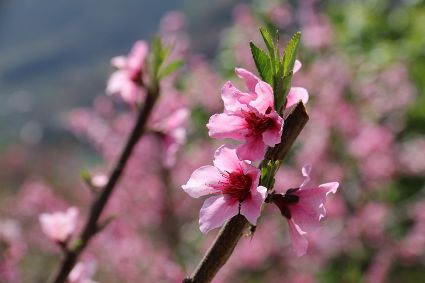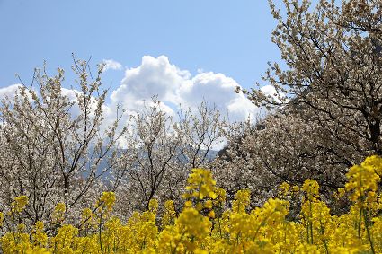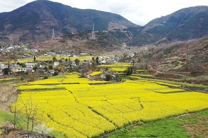 在瀘定縣冷磧鎮(zhèn)、德威鎮(zhèn)等地,桃花、油菜花及櫻花競相開放,一團團、一簇簇,綴滿枝頭,藍天、白云與各色花兒相交,金黃花海在微風中起伏。一畦畦油菜花田錯落有致、層次分明,綿延不斷?!岸聶鸦ㄩ_,三月桃花盛,四月紅櫻桃,五月水蜜桃。”除了油菜花,每年陽春三月,瀘定的桃花也隨著和煦春風落滿枝頭滿樹的花芽沁著香氣,一點點溢到空氣中,香了春風,也香了整座城。