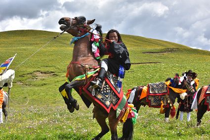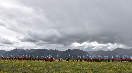 花海上、馬匹間,康巴漢子摩拳擦掌;藍天下、溪流旁,盛裝觀眾搖旗吶喊。19日,作為運動會的分項活動之一,德差鄉(xiāng)羊格貢草原上演了一場500匹駿馬在康巴漢子駕馭下同場飛奔的馬術(shù)表演視覺盛宴。伴隨著鏗鏘有力的馬蹄聲、駿馬的嘶鳴聲和觀眾的歡呼聲,一幅集奔騰之美、力量之美、風(fēng)光之美于一體的壯美畫卷快速閃過觀眾眼簾。
