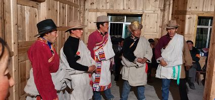 夜臨了,月低垂,整條山谷陷入了藍色的世界,近處是墨綠,遠處是淡綠,雄渾的大山在綠的撫摸下也變得婀娜起來;古老寨子的火塘也燃起來了,勞作了一天的普米人聚在一起,跳起了原始氏族人群圍火而舞的傳統(tǒng)舞蹈,曲調(diào)悠揚且古樸動人。