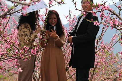 這個時節(jié),著名的賞花之地當(dāng)屬瀘定縣冷磧鎮(zhèn)杵坭的桃花谷。從瀘定縣城出發(fā),沿著大渡河右岸一路往下,行約20分鐘就能看到美麗的田野景色。只見,山頭上,田野間,或是房前屋后,統(tǒng)統(tǒng)換上了美麗誘人的春裝。放眼望去,李花、桃花、油菜花競相綻放,爭奇斗艷。這里,桃花尤其繁盛,沿著山谷錯落有致、次第盛開,讓人目不暇接,用一步一景來形容也一點(diǎn)不為過。