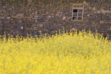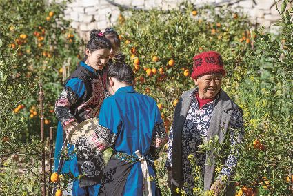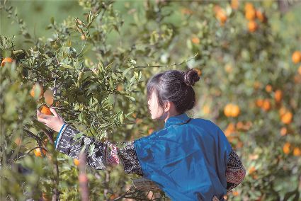 不遠處,農(nóng)家大哥左握微型秤,旁邊框框紅艷艷草莓待稱,右拿手機收付款。穿過溪流木橋,黃四娘家青果累累,爍爍梨花下,女兒正梳妝挽云鬢;沈家河壩菜花黃黃,別院人聲鼎沸。遙想當年,坡陡路險。而今,鄉(xiāng)村振興,片片梯田,阡陌交通,戶戶通路。雨天一身泥,晴天一身灰已不復返。
