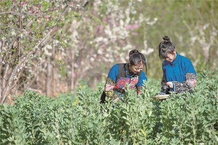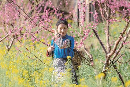 抬望眼,坡上繁花似錦,余暉里,若粉色華蓋覆于坡上,若云若霞。桃林置身峽谷之中,粉面朝天,明艷非凡,宛如閨秀;人家坐落山麓之上,披煙戴云,絕食煙火,疑為仙廬;山溪清卷碧波而去,棲云而眠,漱石而歌,響似佩環(huán)。橘色棧道蜿蜒而上,桃花林里若隱若現(xiàn)棧道間著漢服者,或留倩影,或嗅花香;拾級而上,又見客家姑娘,身著藍底配黑褂,綴以白色圖案,提籃摘豆,俯身拾花,別在耳鬢遠望,若畫中紅印印在發(fā)間,身后白色梨花綠色葉。