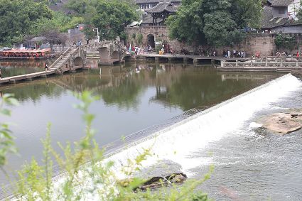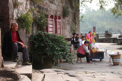 大榮橋。這座建在瀨溪河上、歷經(jīng)數(shù)百年的古石橋,一頭連著大足的地盤,一頭連著榮昌的地盤,故名。看大榮橋的最佳觀景點設(shè)在大榮寨對面的萬靈山腰,從那里看大榮橋和橋拱那端毗鄰的大榮寨,一種看白描連環(huán)畫中古鎮(zhèn)的感覺,就冉冉升起了。