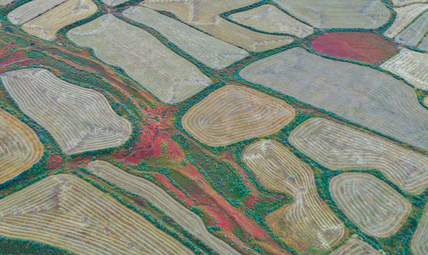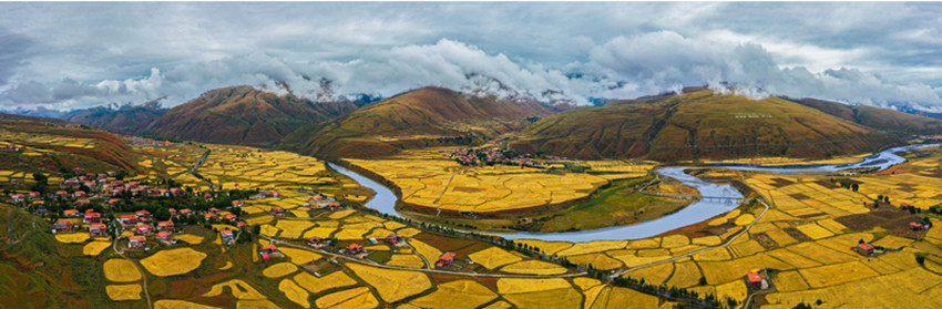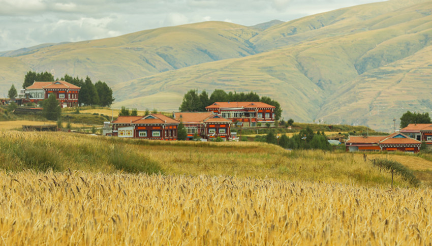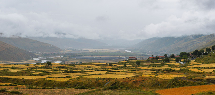 從立秋開始,陽氣漸收,萬物內(nèi)斂。在希望的田野上,主色調(diào)也從象征繁茂、成長的翠綠向代表成熟收獲的金黃漸變。爐霍縣蝦拉沱鎮(zhèn),藏房零星地點(diǎn)綴在田野間,成熟的農(nóng)作物漸染了整個(gè)秋季,讓這個(gè)小村莊如同一幅色彩斑斕的油畫。