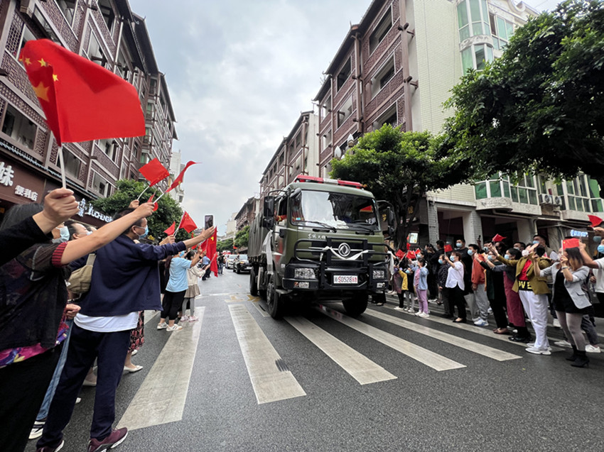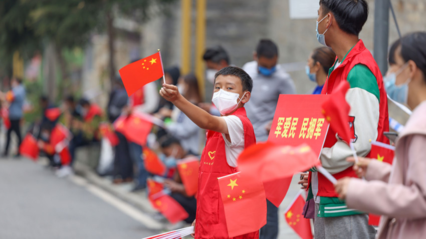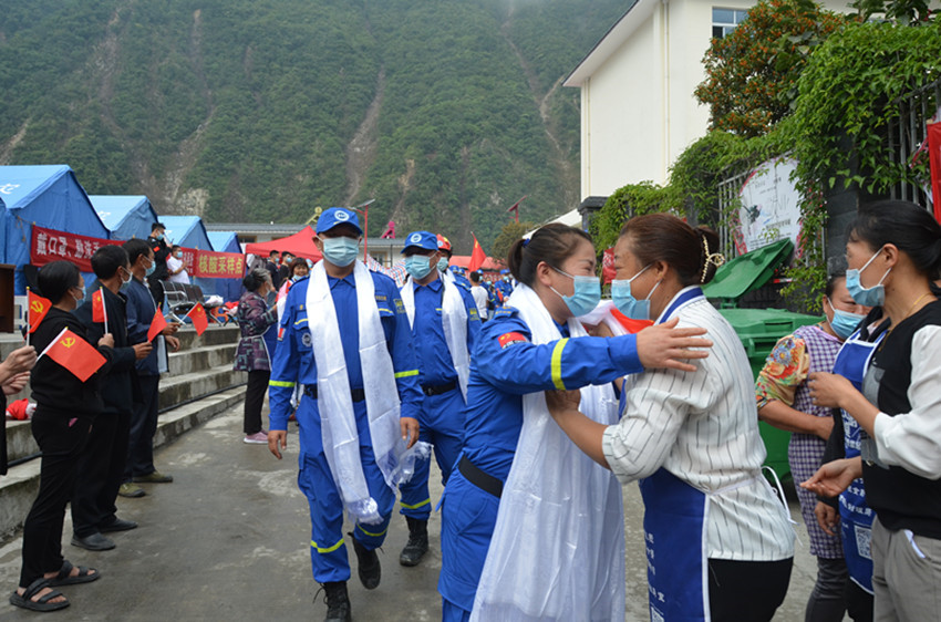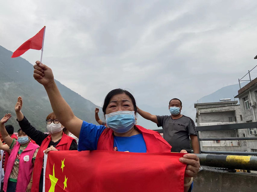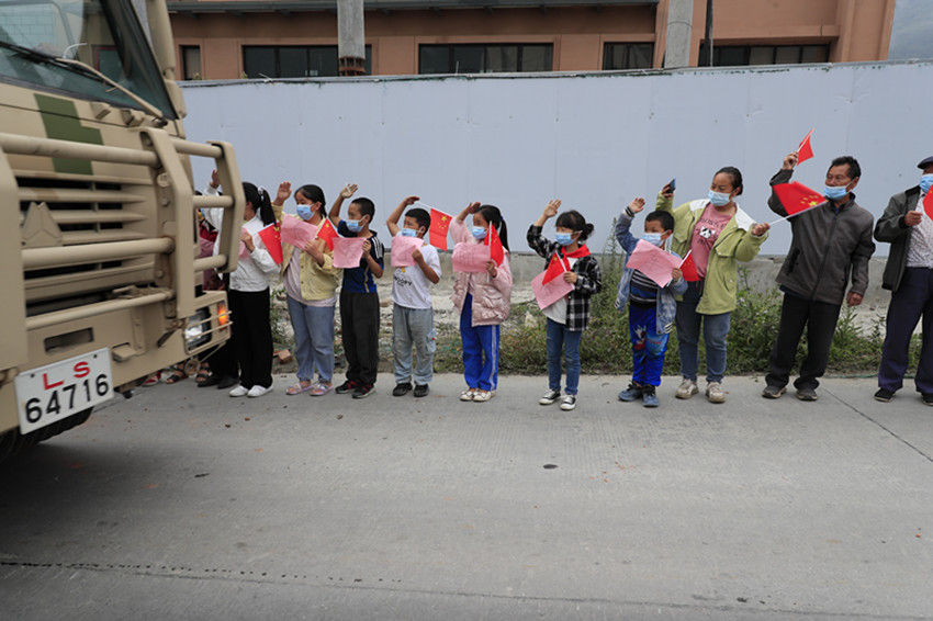 在磨西鎮(zhèn)大坪安置點,受災群眾送別救援隊伍。 張建國 攝