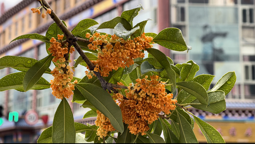 無(wú)間纏綿的秋雨后,漫步在巴塘的街道,悠悠的一股香氣沁入心扉。此時(shí),頭頂?shù)乃{(lán)天,云卷云舒,嬌小的丹桂掛在樹(shù)梢枝頭輕輕搖曳,花香詩(shī)意相融于高原江南別有意趣。