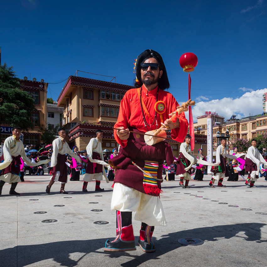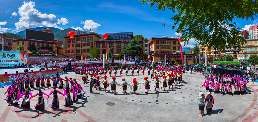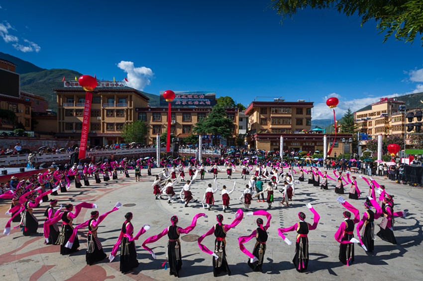 金弦子廣場(chǎng),舞者們仿若守護(hù)者一般,圍著金黃色的弦子雕塑,或輕歌曼舞或昂揚(yáng)踏步,斑斕的畢旺、搖曳的流蘇和飄逸的紅袖與花共舞,與景相映,聲聲吟唱、步步踏尋,是追憶更是誓言。