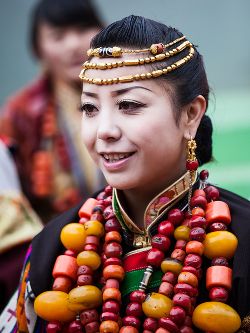 藏裝的基本特點是長袖、寬腰、大襟、肥大。直線寬邊,色彩對比強烈。男女藏袍均習慣以粗紡厚毛呢為料,左襟大,右襟小,一般在右腋下釘一個紐扣,或是用紅、藍、綠、雪青等色布做兩條飄帶,穿時結(jié)上。男式藏袍多為黑、白兩色,領(lǐng)圍、袖口、衣襟和底邊,鑲上色布或綢子底邊,古樸渾厚。夏天或勞動時,一般只穿左袖,右袖從后面拉到胸前搭在左肩上,也可左右袖均不穿,兩袖束在腰間,古銅色的皮膚袒露于外,雄風凜凜,彪悍剛健。女式藏袍,分有袖和無袖的兩種,夏秋兩季的藏袍無袖。里面多襯有紅、綠等色彩鮮艷的襯衣,襯衣翻領(lǐng)在外,衣袖要長于胳膊一至二倍,長出部分,平時卷起,舞蹈時放下,舒展飄逸,瀟灑自如。藏族的帽子式樣繁多,各地均有不同,拉薩等地以金寶頂帽為最多,用金絲或銀絲繡織圖案,在陽光照耀下,閃閃發(fā)光。金花帽是男女老幼都喜歡戴的民族帽。男女穿的藏靴,底高二寸,靴腰高至小腿以上,靴面用紅綠相間的毛呢裝飾,繡有圖案花紋。靴頭向上隆起。藏族男女喜歡佩飾。耳穿大環(huán),手腕金銀,頂戴珠鏈,尤其是在腰間,男挎長劍,女佩腰刀,更顯得粗獷彪美。