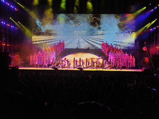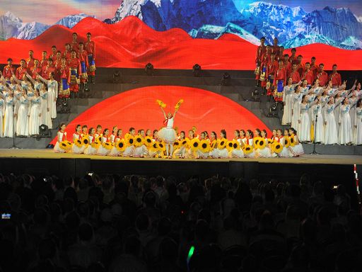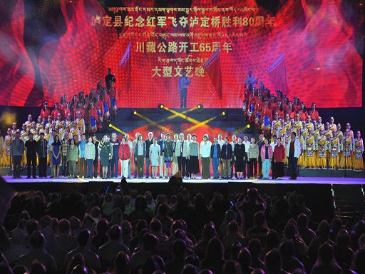 5月29日晚,一臺由中共瀘定縣委、瀘定縣人民政府主辦,四川師范大學(xué)承辦的瀘定縣紀念紅軍飛奪瀘定橋勝利80周年暨川藏公路開工65周年大型文藝晚會《永遠的豐碑》在瀘定縣瀘定橋廣場震撼上演,200多名演職人員參與演出,萬余人現(xiàn)場觀看。