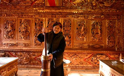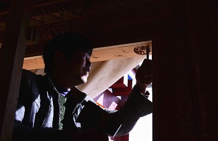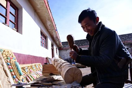 道孚民居的精華在其內(nèi)部,木材是其唯一的內(nèi)部裝飾材料,而裝飾,是一項(xiàng)繁瑣得曠日持久的藝術(shù)勞作,往往建房只需一兩個(gè)月,內(nèi)部裝飾則要幾年甚至幾十年。民間建筑藝術(shù)家們沉醉在細(xì)致入微的勞作里,讓每一個(gè)圖案都盈溢一份心底的吉祥,讓每一筆描摹都傳遞一份動(dòng)人的傳說。房間四壁、房門和梁柱上一般都繪滿了精致典型的藏式壁畫,窗上分別雕刻著龍、鳳、仙鶴、麒麟等吉祥圖案。每間屋的大門上都鑲嵌醒目的兩個(gè)獅頭大銅環(huán),凸顯了與之相融的漢文化的特點(diǎn)。置身其間,色彩斑斕中,身邊盡是龍飛鳳舞,鶴翔麟躍。繽紛中細(xì)端詳,真是藏民族藝術(shù)的天堂!