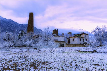 我以這份孤獨(dú)和執(zhí)著,爬上了東邊的山坡。雪停了,微風(fēng)習(xí)習(xí)。櫻桃花、桃花在雪枝頭冷艷,淡淡的幽香徐徐浸入心扉。滿眼望去,一片晶瑩,一片潔白。古碉藏寨在這片世界里,寧?kù)o安詳,不容一絲一毫的驚擾。我懷疑自己進(jìn)入了那種叫做空靈的境界。