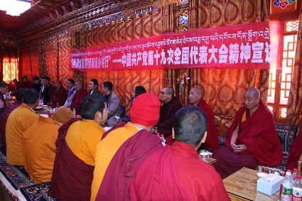 宣講團成員勇勇用藏語激情洋溢的宣講黨的十九大精神,現(xiàn)場不斷響起熱烈的掌聲。當勇勇講到我國五年來取得的輝煌成就時,僧人們都激動不已,紛紛為發(fā)展成就點贊?!奥犃私裉斓男v,我進一步了解到了我們國家這些年來取得的發(fā)展成就。一直以來,黨對我們的關懷是看得見摸得著的,現(xiàn)在我們的寺廟管理越來越規(guī)范,基礎設施也得到了完善,通往寺廟的道路也有了明顯改善,我們的生活越來越好了,這一切都是共產(chǎn)黨的功勞。”寺廟僧人尺乃表達著對黨的感恩。