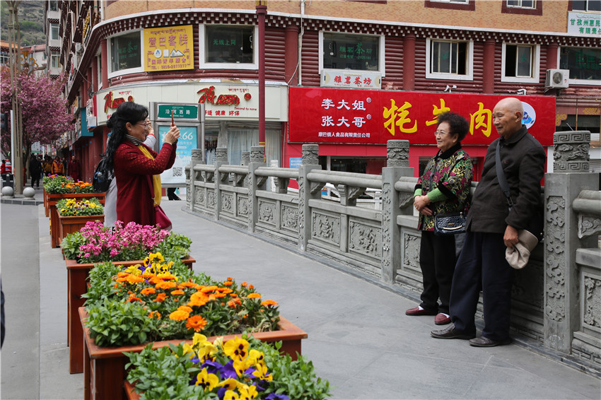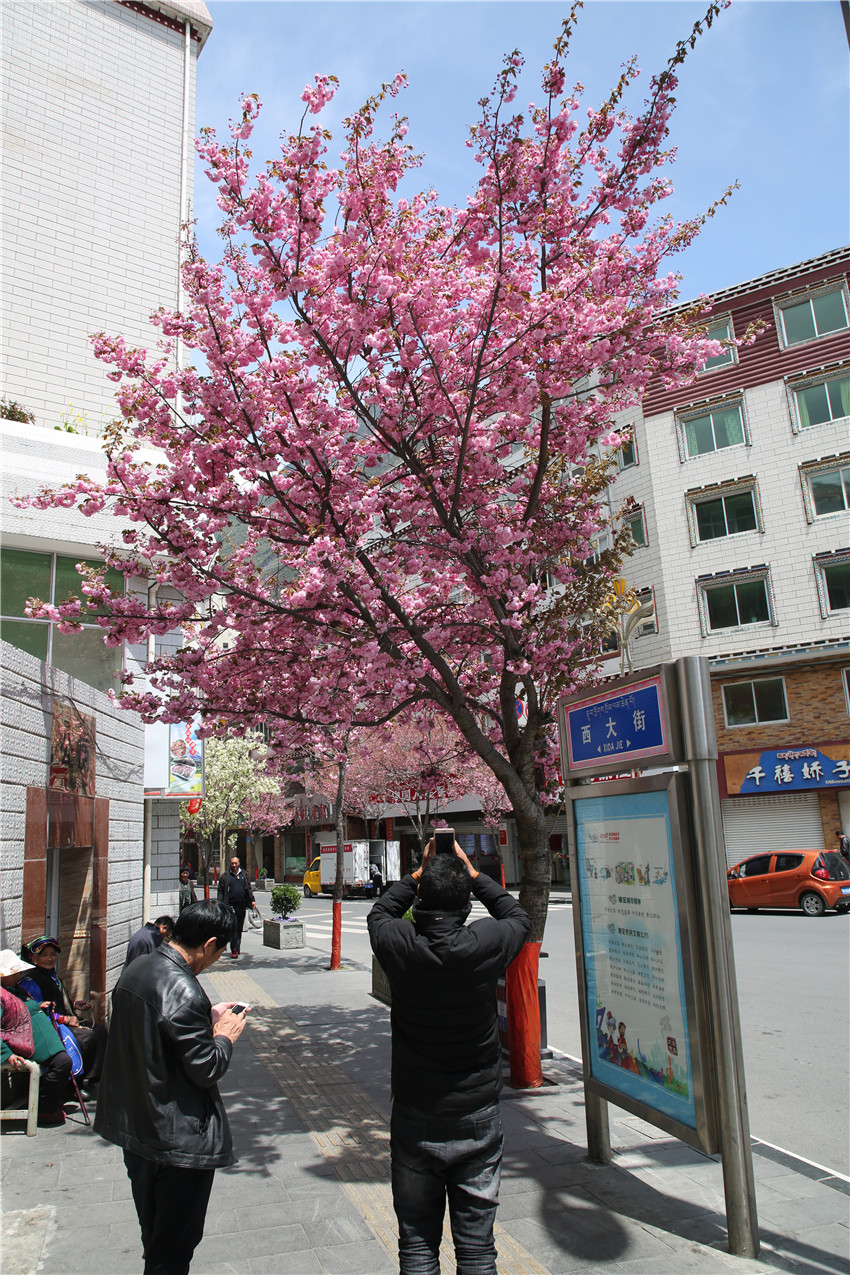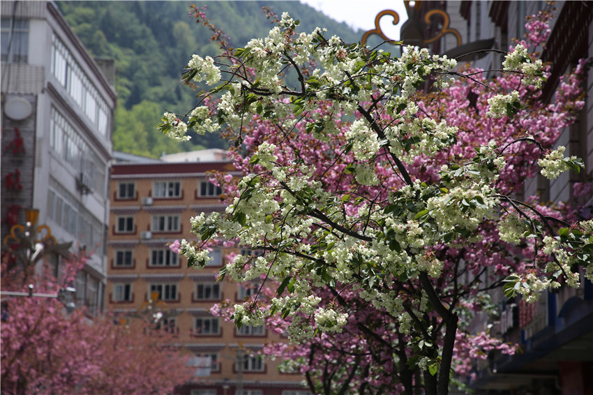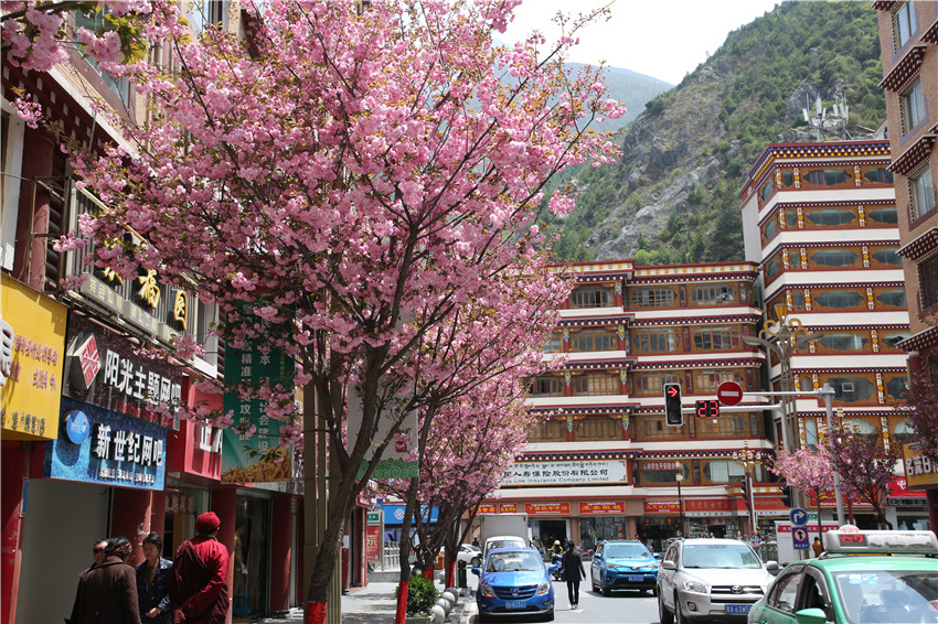 當(dāng)春天遇見最美的櫻花時(shí),驚艷了整個(gè)康定。櫻花與身邊人都將成為春日里的浪漫風(fēng)景。櫻花之美,美在氣勢(shì),櫻花紛飛,夢(mèng)幻唯美。每年4月中旬,康定城北門的櫻花綻放后,人們像是約好了一樣聚集到這里,共赴這一場(chǎng)甜美盛宴。這一路繁花似錦,人們穿過枝椏花正盛的櫻花林,穿過粉色海洋,徑直奔向一個(gè)浪漫的童話,一路櫻花飄散,一路粉光燦爛。櫻花絢麗繽紛、陸續(xù)綻放,若恰逢一陣春風(fēng)經(jīng)過,櫻花瓣隨風(fēng)舞動(dòng),猶如紛落的雪花,空氣中浮動(dòng)著櫻花特有的淡淡香氣,令人不禁懷疑自己置身夢(mèng)境?!翱刀ǖ拇禾靵淼靡硪恍?,綻放的櫻花,滿街的花草,折多河畔楊柳依依,康定的春天無比驚艷,醉了游人。”周先生一邊拍照,一邊感嘆,他在康定生活了40多年,20年前的康定,可以說找不到像樣的花草樹木,進(jìn)入新時(shí)代,康定城市變美了,城市綠化走在了前面,城市的美譽(yù)度舒適度不斷提升??刀ㄖ?,春色滿園,姹紫嫣紅,風(fēng)光旖旎。
