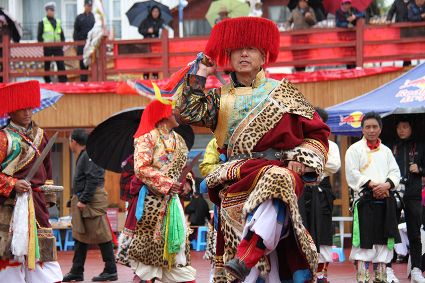 射箭也是德欽以及周邊些村落的重要民俗活動(dòng)之一,村里的男人們盛裝出場(chǎng),在射箭場(chǎng)彎弓搭箭,從7、8歲小孩到50多歲的老人都要參加射箭,甭管你射得中靶子與否,笑聲里充滿了和諧和喜慶。德欽縣的江坡村,在每年桃花盛開(kāi)的季節(jié),都要開(kāi)展盛大的射箭節(jié),全縣的射箭愛(ài)好者都前來(lái)一顯身手,康巴漢子們不僅射得一手好箭,還得會(huì)拉弦子,悠揚(yáng)的弦子聲可以給射手們加不少分,活動(dòng)的初衷就是要求藏族男人必須能文能武。弦子聲聲,唱出了藏家百姓美好的生活,村里的女人戴上了各種金銀首飾,男人們手拉弦子,盡情歡暢的唱著、跳著,村里的老人們是忠實(shí)的觀眾,看著大家在舞場(chǎng)里的步子,他們也跟著笑得合不攏嘴,有些年輕人還不時(shí)跑出舞場(chǎng)到場(chǎng)邊的老人們面前請(qǐng)教弦子的唱詞,老人們總是不厭其煩的傾囊相授,因?yàn)樗麄冊(cè)?jīng)也是弦子舞場(chǎng)的“明星”。