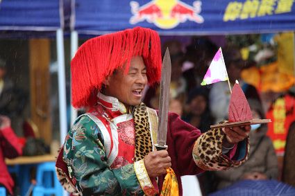 除了歌舞文化,德欽還是民俗文化最大的平臺(tái),神山祭祀是村村寨寨必不可少的活動(dòng),在德欽,藏民對(duì)山水自然賦予了靈性,認(rèn)為自然也是和人一樣有著生命和靈性,尊重自然演繹出神山祭祀活動(dòng)豐富多彩?!暗顿潯?藏語(yǔ)稱“百諧”。在德欽農(nóng)村,刀贊是祭祀活動(dòng)的重頭戲,這一天,不亞于一個(gè)盛大的服飾表演。相傳“百諧”是古時(shí)村民為消除戰(zhàn)亂,祈福平安的一項(xiàng)傳統(tǒng)祭祀活動(dòng),延續(xù)至今已經(jīng)成為一項(xiàng)傳統(tǒng)的民俗活動(dòng)?!鞍僦C”既是祭祀活動(dòng)的一個(gè)儀式,也是一個(gè)獨(dú)立的傳統(tǒng)民俗活動(dòng),村里每戶一男丁在這一天必須參加“百諧”?!疤K夏”是村里男人戴的最為隆重的帽子,他不同于金邊帽和狐皮帽。長(zhǎng)刀是“刀贊”的道具, “吉祥的日子里,我們一敬天地,賜給我們帶來(lái)幸福的生活;再敬尊敬的共產(chǎn)黨,為我們帶來(lái)平安吉祥;三敬慈祥的雙親,教會(huì)我們?nèi)绾巫鲆粋€(gè)好人……”朗朗上口的說(shuō)詞伴著閃閃的刀光起舞,頗具康巴壯士的英武陽(yáng)剛。