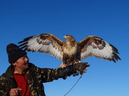 “小一點的鷹好訓(xùn),訓(xùn)老一點的叫熬鷹。 開始熬鷹前,一次性喂飽鷹,七天七夜不吃不喝不睡覺,待七天時到,放鷹于空,手中拿肉,用我們倆特殊的交流方式指揮它,這時它會落我的手臂上。但是,這一只始終沒服過我。訓(xùn)出來一只大約半月左右。”訓(xùn)鷹人說。