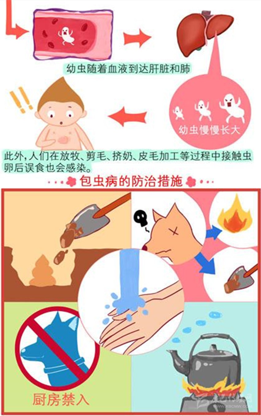 我們先看包蟲病的發(fā)生過程:狗、狼、狐貍等食肉動物食入感染棘球幼蟲(棘球蚴囊里可會有數(shù)百萬個棘球幼蟲)的羊、牛、豬、馬、鹿、兔、鼠的生內(nèi)臟或未熟的肉類后,棘球幼蟲在它們小腸腸壁隱窩內(nèi),經(jīng)7-8周生長,發(fā)育成為米粒大小的成蟲——棘球絳蟲。成蟲有頭、頸、體節(jié),體節(jié)中有成節(jié)和孕節(jié),成蟲無雌雄之分,屬于雌雄同體,每隔7-14天蟲卵形成,孕節(jié)脫落隨糞便中排出,成節(jié)再發(fā)育為孕節(jié);同時,成蟲還可自然下滑其肛門引起肛門發(fā)癢,這時狗、狼、狐貍等回頭用舌舔、牙咬,孕節(jié)被壓碎,蟲卵排出。脫落的孕節(jié)可沿草地或植物蠕動爬行,孕節(jié)邊走邊下蛋,導(dǎo)致蟲卵四處擴撒。蟲卵細(xì)小,肉眼看不見,它在干燥環(huán)境中能存活11-12天,在2℃水中能活2.5年,在冰中可活4個月。就是這樣蟲卵它引起狗自身和與其接觸的羊、牛、豬、馬等家畜的皮毛污染外,它還隨著狗、狼、狐貍等活動場所不同污染牧場、畜舍、蔬菜、土壤及水源等環(huán)境;毫無警惕,多而細(xì)小的蟲卵它們易被人和羊、牛、豬、馬、鹿、兔、鼠等草食動物誤食吞下,吞食的蟲卵它們很快在機體的腸內(nèi)孵出變?yōu)橛紫x,幼蟲鉆入腸壁,隨血循環(huán)到達我們和羊、牛、豬、馬、鹿、兔、鼠等草食動物的肝、肺、腦、心、腎等器官居住下來,緩慢生長,引起對應(yīng)部位的包囊蟲(又稱棘球蚴),出現(xiàn)包蟲病。包蟲病嚴(yán)重程度取決于包囊蟲的體積、數(shù)量、寄生時間、部位和繼發(fā)反應(yīng),而危害人畜健康和生命安全。