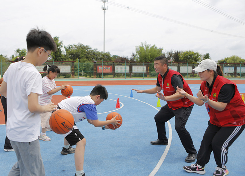 志愿教練指導(dǎo)小朋友學(xué)習(xí)籃球。