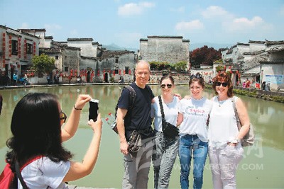 圖為外國游客在中國安徽宏村合影。新華社發(fā)