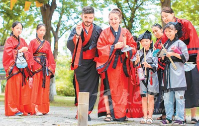 浙江省長興縣陳武帝故宮內(nèi),外國游客和學(xué)生們一起體驗投壺游戲。