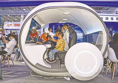 5月27日,孩子們?cè)凇皵?shù)博會(huì)”上通過(guò)虛擬電動(dòng)車(chē)體驗(yàn)綠色出行。新華社記者 楊文斌 攝