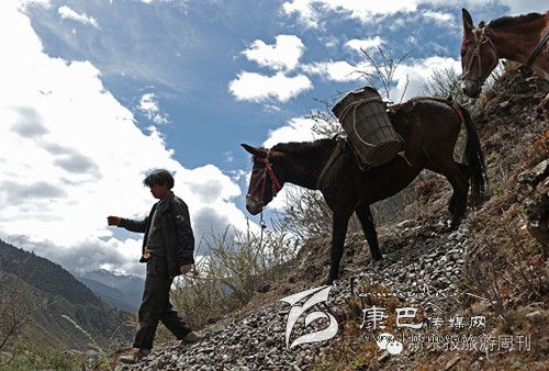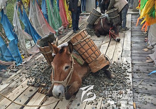 這是318和317國(guó)道都不通過的甘孜州白玉縣,從白玉縣城通往建設(shè)鄉(xiāng)德沙村的路是一條木制棧橋,2014年5月4日的中午,兩頭騾子在300斤石料的重壓下踩斷了中間的橋板,兩條前腿從踩碎的木板處懸著,騾子發(fā)出粗壯的喘息聲,無法掙扎,不能動(dòng)彈。棧橋上有路過的藏民,手中旋轉(zhuǎn)著轉(zhuǎn)經(jīng)筒,他口中念念有詞:騾子啊,你還沒有得到解脫。一群來自外地的游客都很驚詫。 騾子運(yùn)輸隊(duì)的王玉海,在過往行人和同行的騾隊(duì)鄉(xiāng)親的幫助下,先卸下騾子身上背負(fù)的碎石,然后手伸到騾子前腿根處,用力抬起騾子的前身。在查看騾子沒有受傷后,王玉海把這兩只騾子牽到騾隊(duì)最后面,然后,引著另外5只負(fù)重的騾子,從橋靠左邊的雙層木板橋面上通過,騾子隊(duì)受到驚嚇,不愿意上橋,王玉海安撫了一會(huì)兒騾子隊(duì)后,在同伴的協(xié)作下,前面牽引,后面驅(qū)趕,終于,王玉海的7只騾子過橋,其他8個(gè)同伴的50多頭負(fù)重的騾子也一一通過。