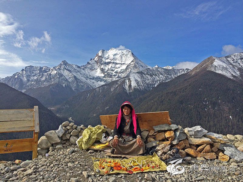 那姆說的那一座打敗她的雪山是仙乃日,亞丁的三座雪山之一,其他兩座是夏諾多吉和央邁勇。我們在仙乃日的觀景臺拍照,一個藏族婦人端坐在埡口,來來往往的游客把她和雪山的背景攝入鏡頭。有個亞丁鎮(zhèn)的人搭乘了我們的大巴,他站在埡口,從衣服里拿出一疊風馬旗,朝天空揮灑,五顏六色紛紛揚揚。在藏區(qū),神山的埡口,經(jīng)常能夠看到揮灑風馬旗的人,祝福長路,愿你一路平安。
