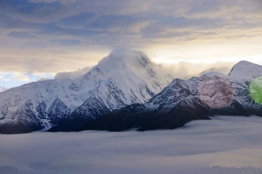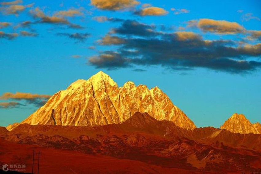 貢嘎山位于康定城南約55千米處,“貢嘎”為藏語“雪白”之意。貢嘎山險(xiǎn)峻挺拔,峰項(xiàng)有70平方米的平臺,終年積雪覆蓋,晴空萬里時(shí),閃耀著熠熠光芒,瑰麗壯觀。