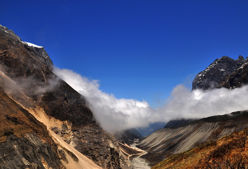 第二天,我們準(zhǔn)備游玩燕子溝,醒來的第一件事就是拉開窗簾看看天氣,又一陣興奮,天氣依然非常晴朗,今天是進(jìn)燕子溝的第一天,我早做足了準(zhǔn)備,太陽(yáng)帽、墨鏡、食品等等一樣不少。從磨西到燕子溝溝口的路程很長(zhǎng),需要坐景區(qū)的觀光車,因?yàn)樘鞖獾脑?,山上只有少些云霧繚繞,環(huán)在山腰,仿佛是一幅山水畫景。我們先來到了冰窖口,這里的海拔有三千多米,所幸大家都沒有高原反應(yīng),后坐車下山,來到有“定海神針”之稱的一棵高大筆直的杉樹。這棵杉樹皮粗厚,已經(jīng)沒有了樹葉,樹枝也寥寥無幾,更顯滄桑。站在樹下遙望,顯得人是那么渺小。不禁讓人遐想這顆千年古樹的滄桑歷史。然后開始步行游玩,這里海拔比較低,走 起來不是很累,在城市中見慣了高樓大廈,車水馬龍的我們,此刻真有一種離開凡塵,來到世外桃源的感覺,我們一路依山而上,越走越高。我們終于來到了天藥水坪,這里的景色已經(jīng)完全不同于山下,看著遠(yuǎn)處的山,我們都不約而同地“哇”了一聲。