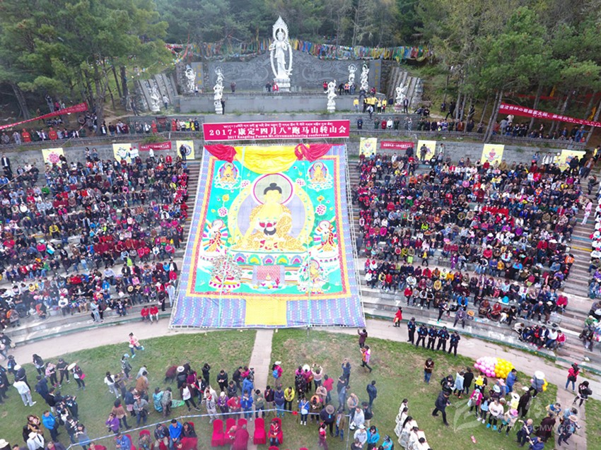 早上6點,跑馬山索道入口已聚集了不少群眾;上午8點,跑馬山情歌坪已被圍得水泄不通;上午9點,“四月八”曬佛儀式正式開始。伴著悠揚的佛陀吟誦和裊裊的煨桑香煙, 巨型釋迦牟尼佛像緩緩揭開蓋簾布展現(xiàn)在陽光之下;成群的青年男女向佛像投去代表祝福和敬意的哈達,虔誠的信徒向其朝拜、叩首。整個過程肅穆而莊嚴。
