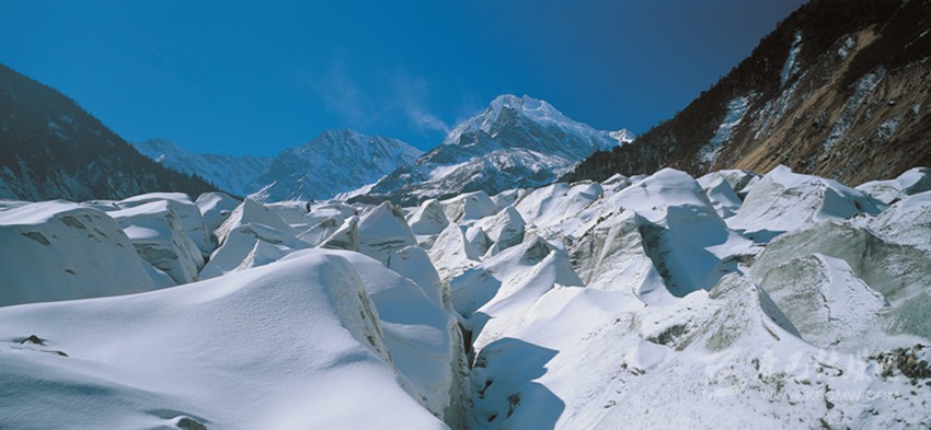 貢嘎山是我國(guó)現(xiàn)代海洋性冰川最發(fā)達(dá)的地區(qū),有數(shù)百條冰川。面積達(dá)300余平方公里。其中海螺溝一號(hào)冰川長(zhǎng)14.7公里,面積16平方公里,是世界上同緯度海拔最低、最大的現(xiàn)代冰川,冰川、森林、溫泉共生,普通游客也可以輕松登臨進(jìn)行游覽。冰川上形成的冰面湖、冰塔、冰橋、冰洞、冰裂縫、冰宮、冰城門(mén)等千姿百態(tài),晶瑩璀璨。尤其是大冰瀑布的寬度和高度均超過(guò)了1000米,由無(wú)數(shù)巨大而光芒四射的冰塊組成,仿佛是從藍(lán)天直瀉而下的一道銀河,終日冰崩不斷。