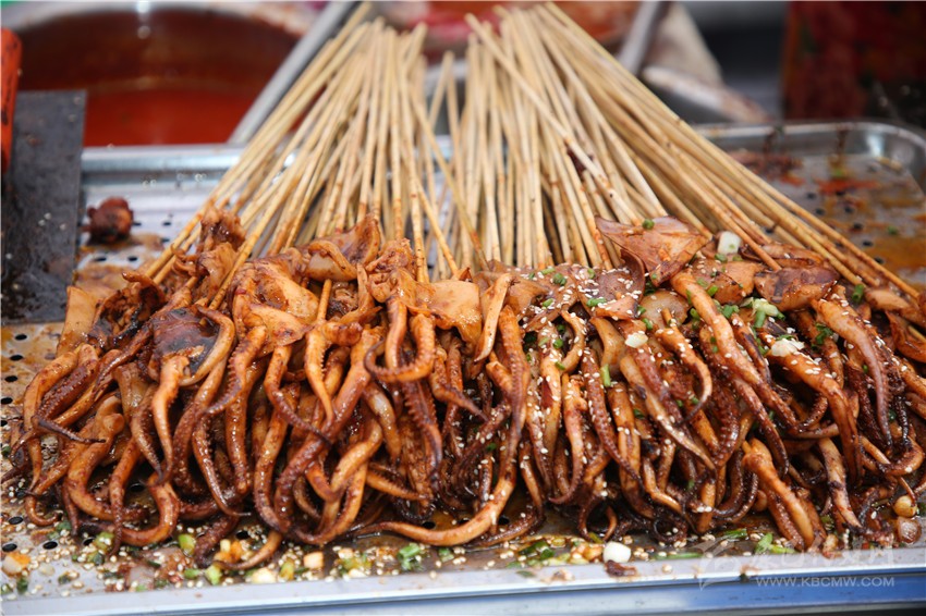 作為一個四川人,對于麻辣味的食物毫無抵抗力,在康定后街林立的商鋪中,記者一眼就相中了“深海魷魚花”這家店??粗褐t油的魷魚花靜靜地躺在紅椒和芹菜間,記者咽了咽口水,向老板買了一份兒?!罢媸羌兗兊拇ㄎ秲簺]錯了,又麻又辣的?!庇浾邔习逭f。老板回答到:“魷魚花最講究的就是刀法了,要切得好看。雖然在顧客看來都差不多樣子,但是我每次都要經(jīng)過細細斟酌再一刀一刀的切,爭取多弄幾種樣式,現(xiàn)在我的??蛡円矔毤毜乜季课仪械聂滛~花了。以前我只賣烤魷魚,只是在家里偶爾會給我兒子做魷魚花,后來看我兒子喜歡吃,才開始慢慢地賣魷魚花,沒想到還是很受歡迎。這次美食節(jié),我發(fā)現(xiàn)沒有人做魷魚花,所以我就帶著我兒子喜歡的魷魚花來參加這次美食節(jié)了?!崩习逍χ浾哒f。