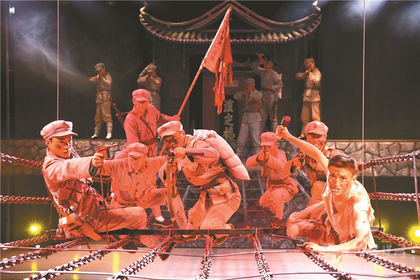 8月20日,記者在地處飛奪瀘定橋公園內(nèi)的紅色劇場(chǎng),看到眾多觀眾在觀看紅色實(shí)景劇《飛奪瀘定橋》,大家隨著進(jìn)入劇情實(shí)景,感受那段歷史壯歌。