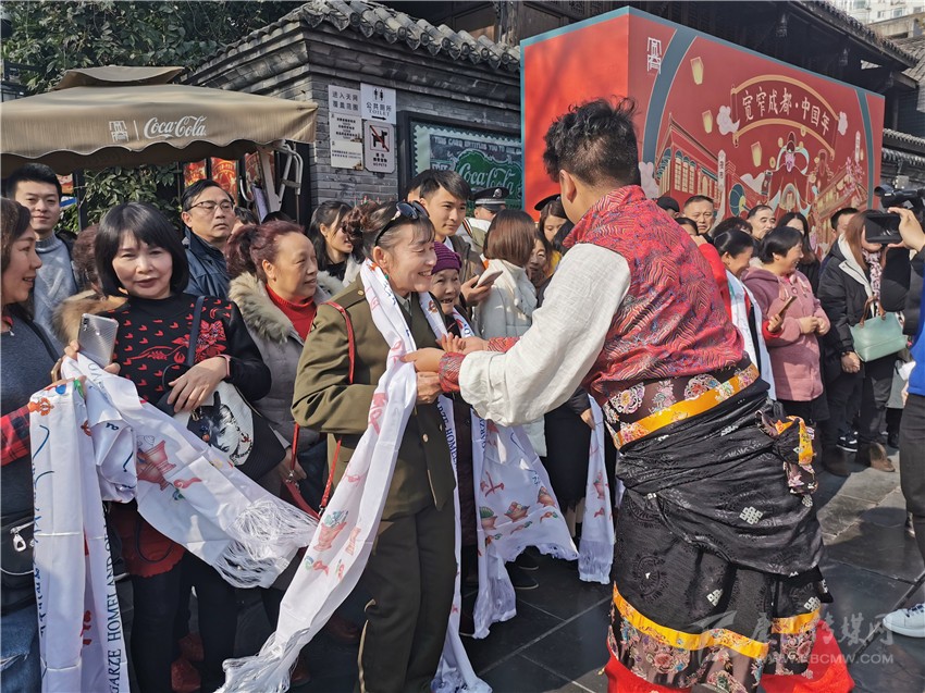 快閃還未開(kāi)始,20名身著少數(shù)民族服裝的藏族姑娘小伙,便成為了一道最獨(dú)特、亮麗的風(fēng)景線。隨后,他們給游客們帶來(lái)了獨(dú)具甘孜特色的歌舞《康定情歌》《甘孜踢踏》,悠揚(yáng)的歌聲、奔放的舞步,讓圣潔甘孜大美天成的獨(dú)特風(fēng)韻完美展顯,吸引了春熙路如潮的人群,被歌舞魅力感染,不少市民隨著他們一起唱跳了起來(lái)。而此時(shí)的成都寬窄巷子里,也正在演繹著一場(chǎng)震撼的“快閃”,四名穿著格薩爾王服飾的大將,身披鎧甲、手持刀劍,格外威武帥氣,市民和游客紛紛拿出手機(jī)拍照留念?!翱扉W”結(jié)束后,熱情的甘孜兒女為周邊的觀眾獻(xiàn)上潔白的哈達(dá),向他們致以美好的祝福,并誠(chéng)摯歡迎他們到甘孜旅游。