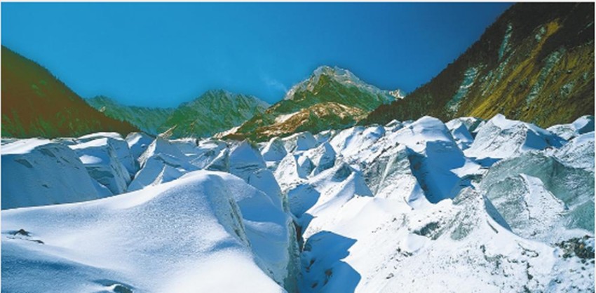 海螺溝位于貢嘎雪峰腳下,以低海拔現(xiàn)代冰川著稱于世。晶瑩的現(xiàn)代冰川從高峻的山谷鋪瀉而下;巨大的冰洞、險(xiǎn)峻的冰橋,使人如入神話中的水晶宮。