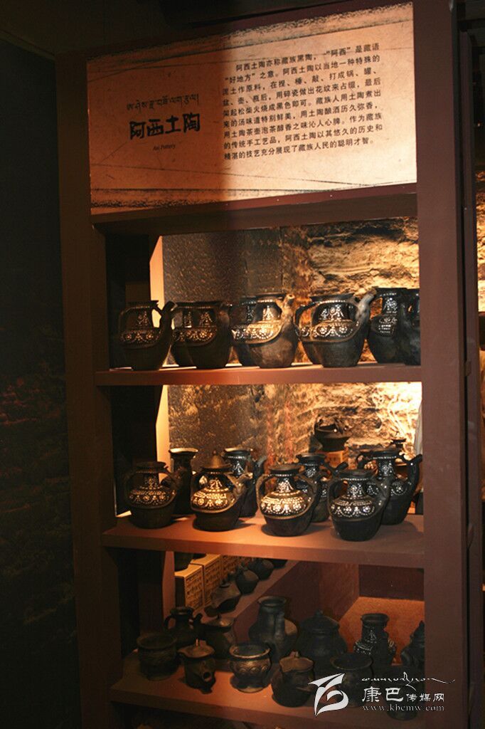 阿西土陶是藏家傳統(tǒng)土法制作的手工藝品,又稱藏族黑陶,因其燒制后呈黑色而得名。阿西土陶以當(dāng)?shù)匾环N特殊的泥土為原料,加上其他兩種泥土混合而成,制作中不斷地捏、錘、敲、打,使之成型,還要用碎瓷做出花紋來點綴,最后架起松柴點火燒,在燒紅的土陶上灑上麥糠就呈現(xiàn)出黑色了。阿西土陶主要表現(xiàn)為陶鍋、陶罐、陶盆、陶壺、陶瓶等形式。最初,當(dāng)?shù)厝艘蕴斟伒葥Q取其它地方的糧食或其它物品,現(xiàn)今的阿西土陶則已經(jīng)走向市場,更多地作為旅游商品和本地人的家庭裝飾品。