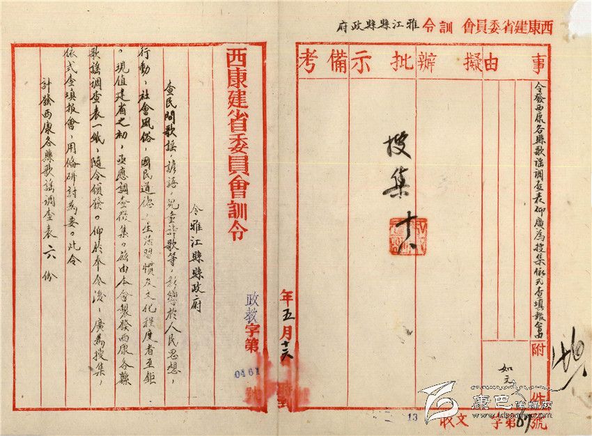 訓(xùn)令題目是“令發(fā)西康各縣歌謠調(diào)查表仰廣為收集依式查填報(bào)會(huì)”,由此可知,西康其他各縣也收到了同樣的訓(xùn)令。其內(nèi)容為:查民間歌謠、諺語(yǔ),兒童詩(shī)歌等,影響于人民思想、行動(dòng)、社會(huì)風(fēng)俗、國(guó)民道德、生活習(xí)慣及文化程度者至巨。現(xiàn)值建省之初,急應(yīng)調(diào)查征集,茲由本會(huì)制發(fā)西康各縣歌謠調(diào)查表一紙,隨令頒發(fā)。仰于奉令后,廣為收集,依式填報(bào)會(huì),備研討為要。此令,計(jì)發(fā)西康各縣歌謠調(diào)查表6份。署名是“西康建省委員會(huì)”。
