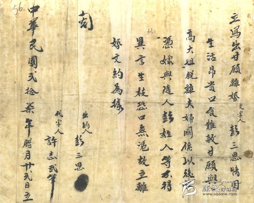 在這張“離婚文約”上看不出女方的任何態(tài)度和意愿,她仿佛只是一個(gè)影子,沒有了光源,影子也就不會(huì)存在。這位姓彭的男子雖是窮極潦倒之輩,身處社會(huì)底層,卻還是擁有對(duì)更為弱勢(shì)的曾經(jīng)是自己的妻子“要還是不要”或者是“放與不放”的特權(quán)。