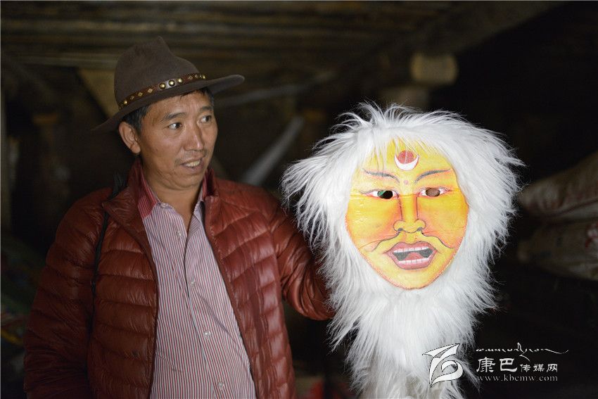 午飯后,洛絨丹巴帶我到離家不遠(yuǎn)的一個小院,推開底樓嘎吱作響的木門,借助外面的光亮,看見有幾個巨大的鐵皮箱。洛絨丹巴打開一口箱子,不想里面整齊地放著各種戲服;第二口箱子是頭飾,唐朝文成公主的、清朝皇帝的。這些服裝和頭飾多是模仿電視電影,或者加上想象自己制作的,個別是外地方買回的。最具特色是第三口箱子,用牛皮制作的各種面具、表情十分夸張,有和善的、猙獰的、威風(fēng)的,神情各異。面具的顏色各種各樣,白色、黑色、黃色、紅色等。眼睛和嘴巴處挖了窟窿,有的還在面具外圍綴了一圈羊毛。洛絨丹巴指點(diǎn)著各種顏色的面具介紹:白色代表純潔、紅色代表威嚴(yán)、黃色代表吉祥;巫女則半黑半白,象征其兩面三刀的性格;青面獠牙代表妖魔。說起這些他如數(shù)家珍。