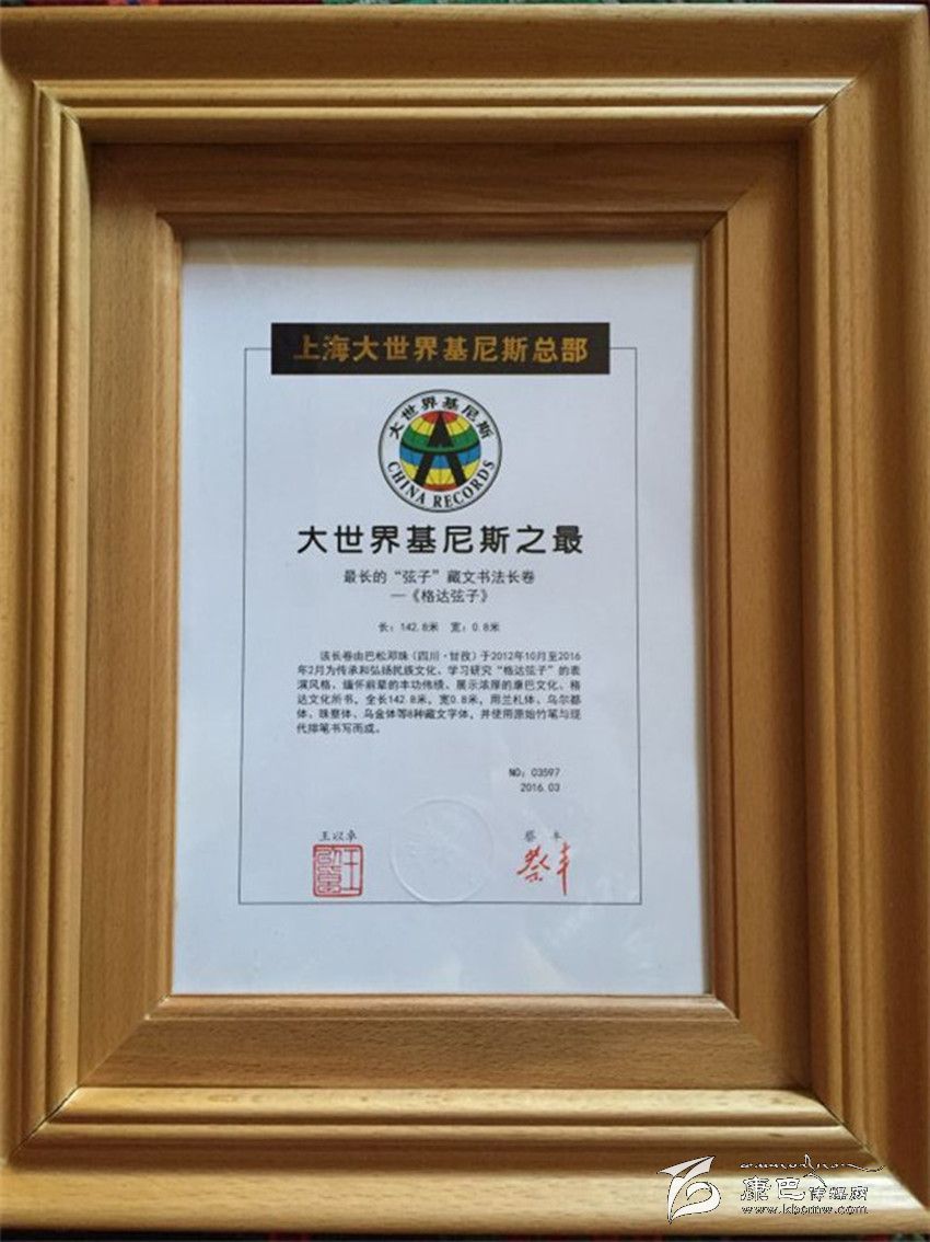 在紅軍長征勝利80周年之際,巴松鄧珠歷時三年創(chuàng)作完成了《格達(dá)弦子詞》藏文書法長卷,以緬懷革命前輩,弘揚(yáng)康巴文化,《格達(dá)弦子詞》日前成功申報(bào)上海大世界基尼斯最長的“弦子”藏文書法長卷?!陡襁_(dá)弦子詞》是巴松鄧珠為傳承和弘揚(yáng)民族文化、學(xué)習(xí)研究“格達(dá)弦子”的表演風(fēng)格、緬懷前輩的豐功偉績、展示濃厚的康巴文化、格達(dá)文化而書寫。該詞以藏族傳統(tǒng)的“弦子”歌舞及編創(chuàng)者第五世格達(dá)活佛而聞名。“弦子”,藏語稱為“諧”,流傳于川、滇、藏等藏族地區(qū),是當(dāng)?shù)厝罕娮詩首詷返膱A圈歌舞。在傳世的弦子舞蹈中,格達(dá)弦子因其更為自由的音樂曲調(diào)、流暢奔放的步法和醒世教人的內(nèi)涵而別具風(fēng)格。五世格達(dá)活佛,生于1903年,住持甘孜縣白利寺。他學(xué)識淵博,25歲時,即取得藏傳佛教“拉榮巴格西”學(xué)位。他精通佛學(xué)和音律,在原有的基礎(chǔ)上創(chuàng)作近30首詩歌,并編配曲目,教人演唱,后經(jīng)民間藝人逐漸演繹豐富,形成了今天唱跳結(jié)合的獨(dú)特的“格達(dá)弦子”。