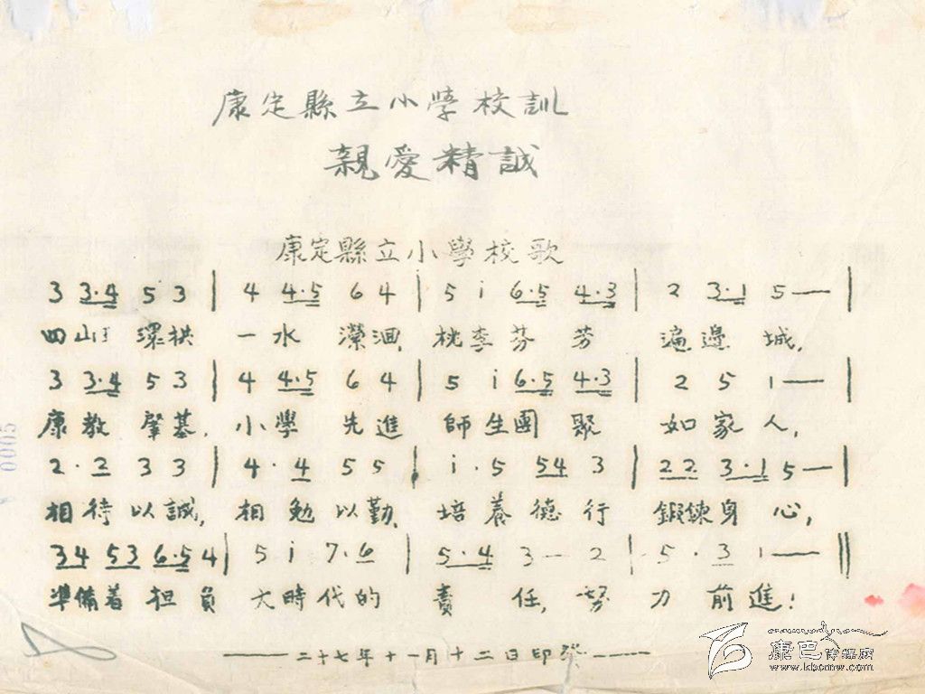 在眾多的民國(guó)教育檔案中,關(guān)于西康省各地學(xué)校的學(xué)生花名冊(cè)、學(xué)生成績(jī)表、學(xué)校經(jīng)費(fèi)運(yùn)用情況,以及教職工領(lǐng)取工薪的領(lǐng)條和表格等等有相當(dāng)大的一部分。難得的是,在這些檔案中竟然出現(xiàn)了兩份“歌譜”。細(xì)看卻不只是“歌譜”,而是兩所小學(xué)把自己學(xué)校的“校訓(xùn)”寫(xiě)成的“校歌”。其中,一份是康定縣立小學(xué)依據(jù)校訓(xùn)“親愛(ài)精誠(chéng)”寫(xiě)成的校歌,另一份是日地短期小學(xué)依據(jù)校訓(xùn)“智仁勇”寫(xiě)成的校歌。通過(guò)這兩份“校歌”,可以看到當(dāng)時(shí)小學(xué)教育已經(jīng)較為正軌,還開(kāi)設(shè)有音樂(lè)課。“校歌”的內(nèi)容積極向上,充盈現(xiàn)在所說(shuō)的“正能量”,鼓勵(lì)學(xué)生努力學(xué)習(xí),成為有擔(dān)當(dāng)?shù)娜恕?/div>