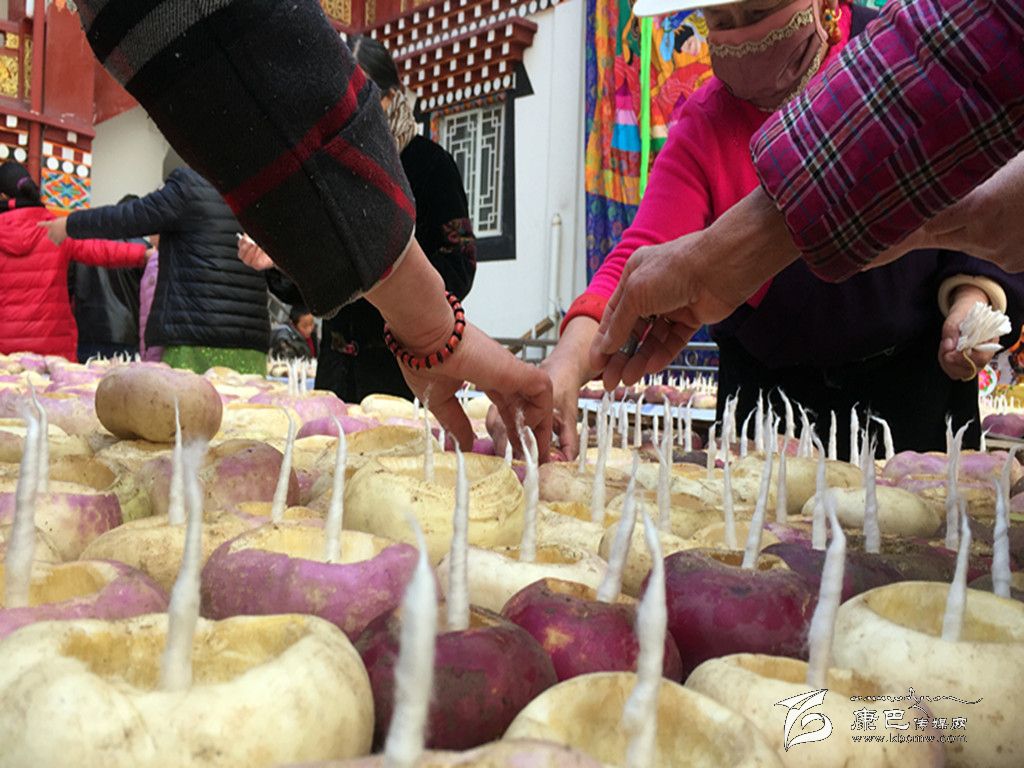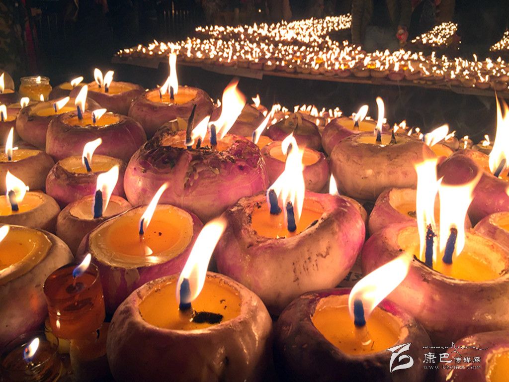 我州最具特色的燃燈節(jié)當(dāng)屬康定市城內(nèi)安覺(jué)寺舉辦的燈會(huì)。每到這一天,康定市民會(huì)將本地盛產(chǎn)的“芫根”洗干凈,然后掏空中間的瓤,在里面放置燈芯,做成酥油燈盞,入夜以后,數(shù)萬(wàn)盞酥油燈一起點(diǎn)燃。因此又稱(chēng)“芫根燈會(huì)”。12月6日晚,康定市民結(jié)伴相約前來(lái)安覺(jué)寺祈福,盛況空前。