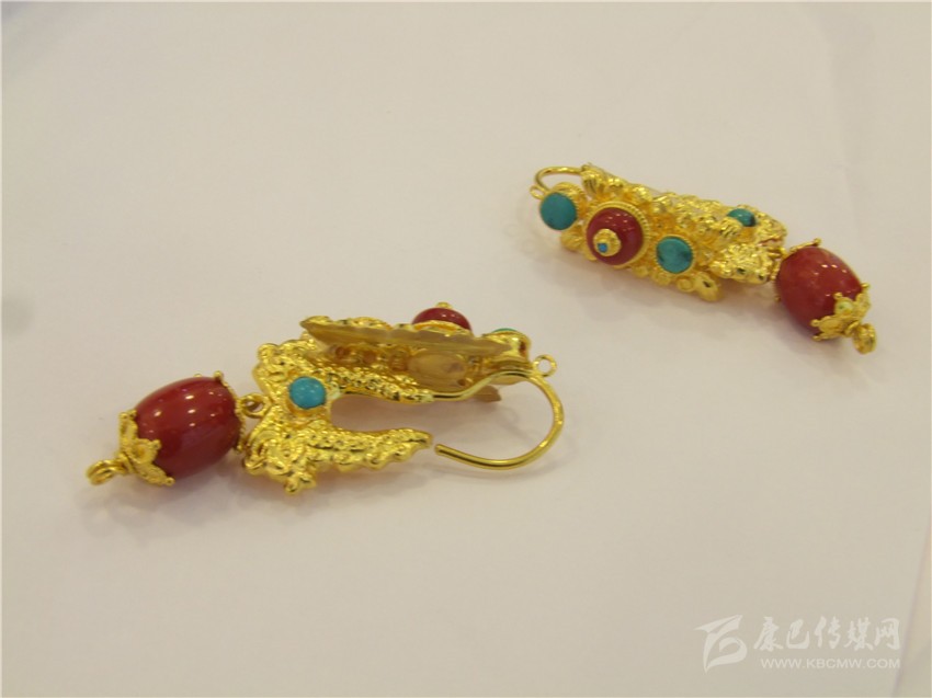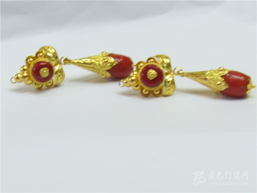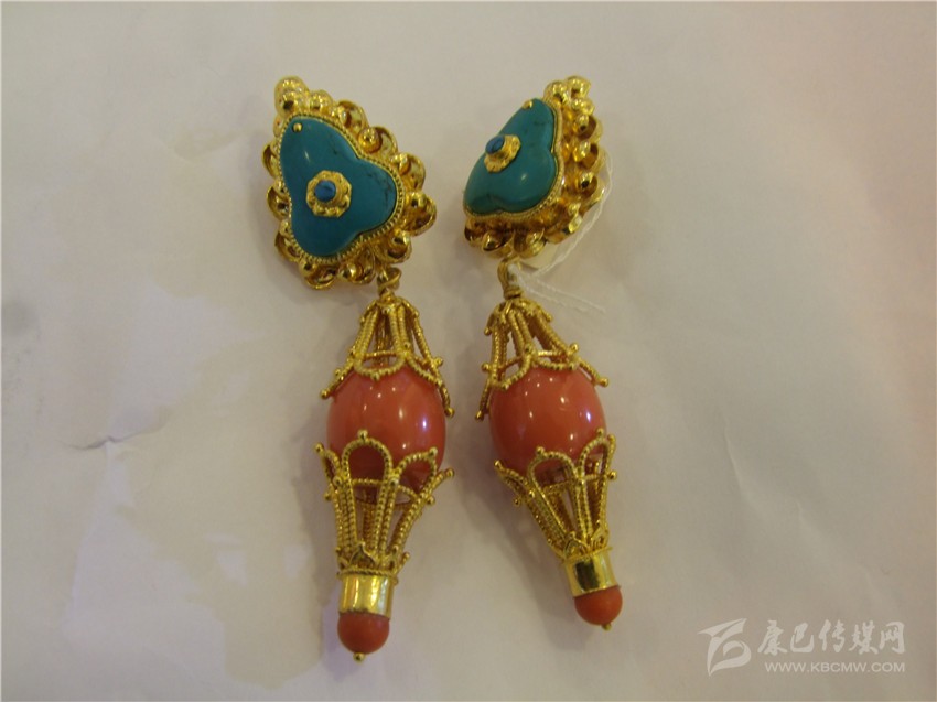 經(jīng)典的紅綠配耳環(huán)。撞色一直都是永不落伍的時尚,紅綠搭配的巧合,是藏民族熱愛生命與熱情好客的象征,用流光溢彩的金色將紅與藍包圍并連接,看起來協(xié)調(diào)而美好,搭配起來更為時尚。據(jù)店家介紹,此款耳環(huán)凈重22.75克,加上手工費,售價7000余元。