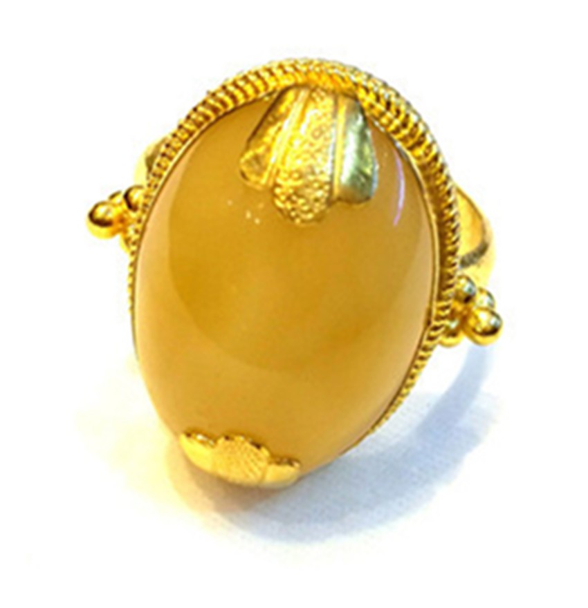 蜜蠟是藏家裝飾中的上成品,藏民族對蜜蠟的喜愛是非常誠懇的,表達著他們對大自然的無限崇敬之情與大自然饋贈的感謝之情。在他們看來,蜜蠟除了能夠作裝飾品佩戴、收藏之外,最引人注目的就是靈性修行之功效,設計師在此款戒指的設計上,緊扣藏民對蜜蠟的喜愛,并將漢式花邊與蜜蠟結(jié)合,是對藏漢文化交流較好的體現(xiàn)。
