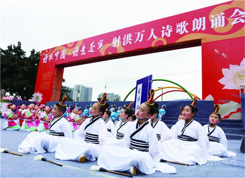據(jù)了解,本次活動是《詩刊》2016年度陳子昂詩歌獎系列活動之一,參與人數(shù)之多、規(guī)模之大,在射洪縣尚屬首次?,F(xiàn)場由射洪中小學生和企事業(yè)單位組成的方陣和演出隊伍,以載歌載舞或配樂詩朗誦等形式登臺表演, 內(nèi)容以經(jīng)典詩詞為主,也有圍繞當前中心工作而創(chuàng)作的新詩。這是文化的傳承,更是血脈的延續(xù)。參加詩歌朗誦會的最小的4歲,或許他們不懂文字背后的美,并不理解字里行間透露出的人生況味,但他們在射洪這樣的文學滋 養(yǎng)中出生、成長。