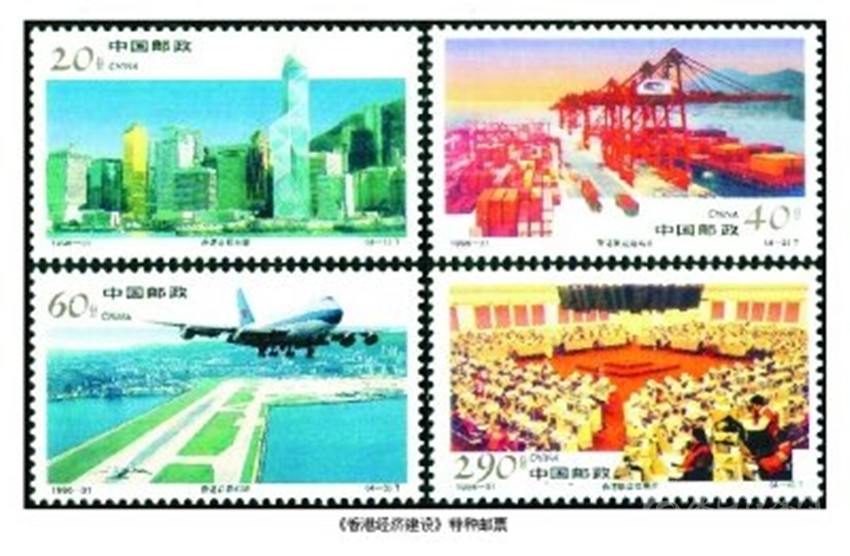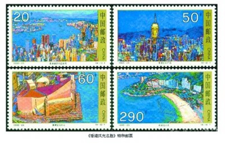 在香港回歸祖國的進(jìn)程中,為了讓全國和世界人民認(rèn)識(shí)香港,了解香港,我國相繼發(fā)行了兩套介紹香港風(fēng)光名勝和經(jīng)濟(jì)建設(shè)的特種郵票。1995年11月28日,我國發(fā)行《香港風(fēng)光名勝》特種郵票,全套4枚。圖案分別為“維多利亞港灣”“中環(huán)廣場”“文化中心”和“淺水灣”;1996年12月19日發(fā)行《香港經(jīng)濟(jì)建設(shè)》特種郵票,全套4枚。圖案分別為“香港中銀大廈”“香港集裝箱碼頭”“香港啟德機(jī)場”和“香港聯(lián)合交易所”。