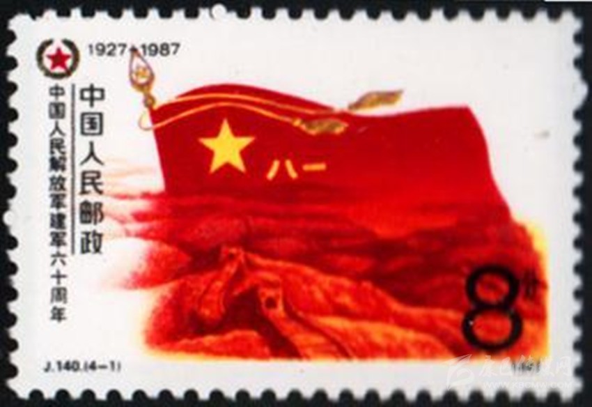1977年8月1日原郵電部發(fā)行的《中國(guó)人民解放軍建軍50周年》紀(jì)念郵票,其中第4枚“雄師過大江”,圖案中一名沖在渡江隊(duì)伍前面的戰(zhàn)士高舉一面“八一”軍旗。1987年8月1日原郵電部發(fā)行的《中國(guó)人民解放軍建軍60周年》紀(jì)念郵票一套4枚。其中第1枚“軍魂”,郵票上一面鮮紅的“八一”軍旗迎風(fēng)飄揚(yáng),旗下是蜿蜒的萬(wàn)里長(zhǎng)城,代表了中國(guó)人民解放軍是保衛(wèi)祖國(guó)和人民的“鋼鐵長(zhǎng)城”。1995年8月1日,原郵電部試發(fā)行一套“義務(wù)兵專用”郵票一套1枚,票名為“神圣的使命”,圖案以紅光四射的“八一”軍旗為背景,以現(xiàn)代化的飛機(jī)、坦克、火箭和象征和平的白鴿為襯托,畫面是威武的陸??杖姡@示我軍鋼鐵長(zhǎng)城般攻無(wú)不克、戰(zhàn)無(wú)不勝的精神風(fēng)貌。