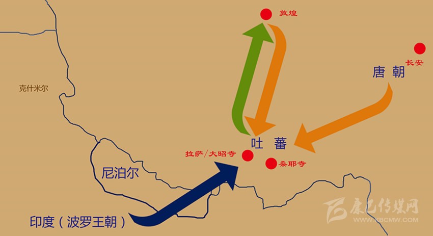 另外,在唐代敦煌繪畫《藥師佛及兩菩薩》的畫面上,藥師佛及脅侍菩薩造型和大昭寺法王殿壁畫的風格非常一致的,都是屬于印度波羅藝術風格。但是畫面中部的文殊菩薩、普賢菩薩則又是中原漢地繪畫風格。在這幅畫的背后有藏文和漢文的題記,講述這幅畫是由一個叫白央的藏族畫家和幾個漢族畫家一起合作完成的。印度的風格影響到了敦煌,同時敦煌的中原繪畫風格又再次傳到了吐蕃。從這些情況可以看出:前弘期的繪畫風格是深受印度波羅藝術和漢地繪畫藝術的雙重影響。