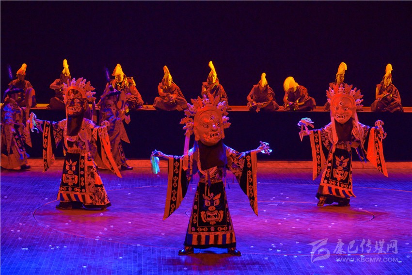 《亞丁?三怙主》歌舞劇不僅從藏族人民日常生產(chǎn)生活中提煉出很多舞蹈文化元素,還對宗教樂舞進行了合理的借鑒。舞劇中用了道孚嘛呢鍋莊、德格卓且、巴塘弦子、爐霍鍋莊、石渠真達鍋莊、丹巴鍋莊、稻城鍋莊等民間舞蹈等元素,加以深化再創(chuàng)作,把原有的民間舞蹈的步伐、舞姿進行夸張性的舞臺處理,并配以適當?shù)年犘?,以更加適應劇場舞臺的表演;大膽創(chuàng)新引入寺廟樂舞,寺廟樂舞本是藏傳佛教寺廟在宗教節(jié)日表演的祈福性舞蹈,舞劇編創(chuàng)人員合理借用寺廟樂舞的音樂、步伐、面具等,用以表現(xiàn)藏族人民與自然抗爭,不懼不屈的精神面貌;用泥土筑墻本是藏族人民建造房屋時的一種建筑技藝,在民間演繹成為地方舞種,舞劇編創(chuàng)人員將筑墻的基本步伐和動作加以提煉,編創(chuàng)了一段約兩分鐘的打舞,用夸張的步伐和動作,配以鏗鏘有力的勞動號子,將豪氣灑脫的打墻舞氣氛推向高潮,以表達藏族人民的勤勞、勇敢與豪邁。州委黨校高級講師陶勇說:“《亞丁?三怙主》歌舞劇旨在講解香格里拉之魂,詮釋亞丁三怙主的本意,闡釋三座神山文化包含佛陀的核心教義。亞丁三怙主即仙乃日(觀世音菩薩)、央邁勇(文殊菩薩)、夏諾多吉(金剛手菩薩),它們分別象征慈悲、智慧、力量。這部歌舞劇是解讀藏民族精神文化、弘揚藏民族真善美勇、傳遞康巴文化真諦的民族歌舞劇。歌舞劇通過《序》、《慈明》、《慧明》、《力明》、《尾聲》五個篇章,充分展示藏族傳統(tǒng)文化中熱情、好客、善良、慈悲、勇敢、追求和諧的優(yōu)秀價值觀,將民族文化融入到社會主義核心價值觀,展現(xiàn)了當代人民群眾的幸福生活。同時對游客來講不僅豐富了亞丁文化,填補了游人僅僅觀賞雪山不知文化內涵的短板,為以后推介甘孜州做了很好的示范?!?/span>