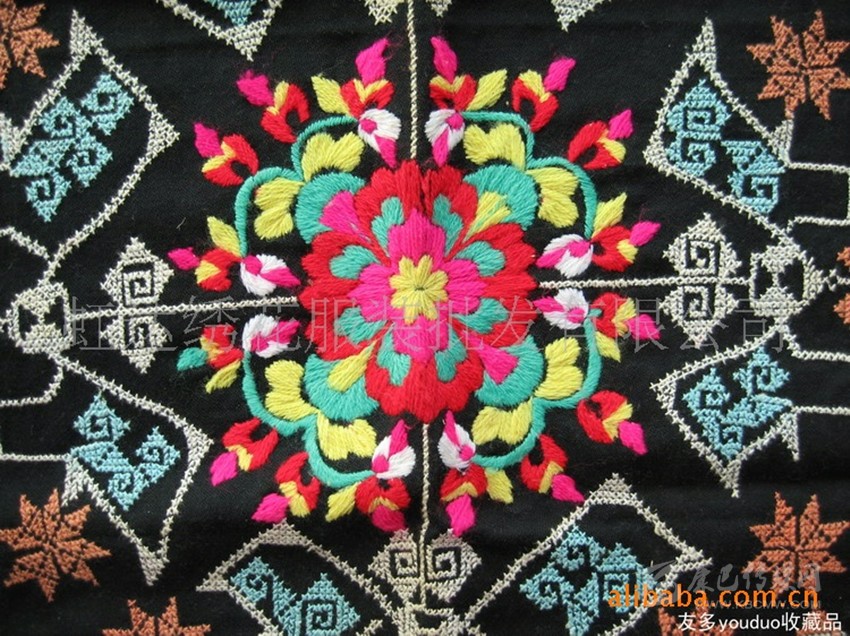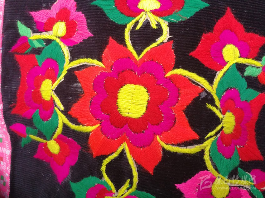 在這里,婦女們猶愛花草。所以,他們的刺繡作品,有生活的細(xì)節(jié)滲透,如氣息,若有似無,相互浸潤(rùn)。無論是花蔓纏枝,還是朵花團(tuán)簇,都從生活中提煉,視之便信手拈來,放在青布黑衫之上,鮮艷奪目,張顯著生活在這方水土之上,人們獨(dú)特的審美情趣。